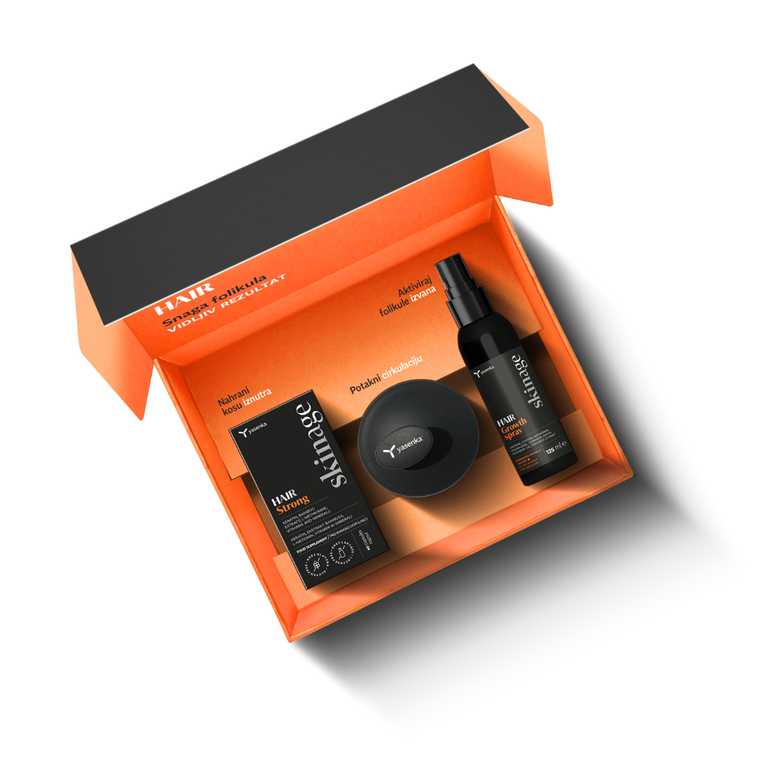 HAIR STRONG KAPSULE za žene– Dodatak prehrani koji hrani kosu iznutra, jača njezinu strukturu i smanjuje ispadanje. Formulacija s klinički ispitanim sastojcima djeluje na korijen kose, potiče sintezu keratina i podupire zdravi ciklus rasta. Sadrži: Cynatine® HNS (bioaktivni keratin), ekstrakt izdanka bambusa, L-metionin, željezov bisglicinat, cink glukonat, vitamin C, pantotensku kiselinu (B5), biotin (B7) i vitamin B12.