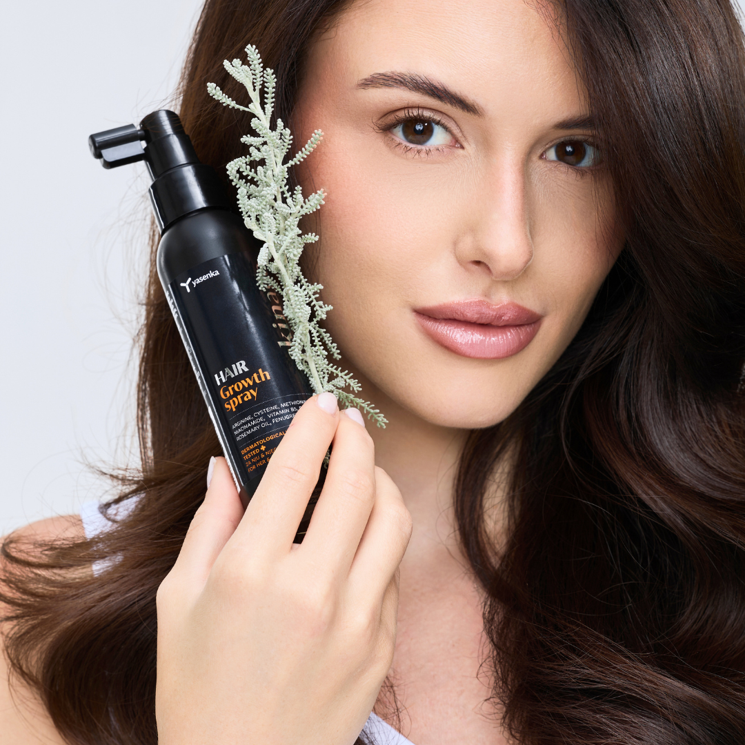 HAIR GROWTH SPRAY– Dermatološki ispitan sprej, formuliran za mikrocirkulaciju, aktivaciju folikula i produljenje anagene faze. Arginin, cistein i metionin ciljaju vaskularnu i keratinsku komponentu; niacinamid (B3) i biotin podupiru barijernu funkciju i homeostazu vlasišta; ružmarinovo ulje i ekstrakt piskavice doprinose balansu sebuma i smirivanju lokalnih upalnih odgovora.